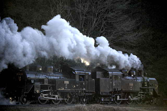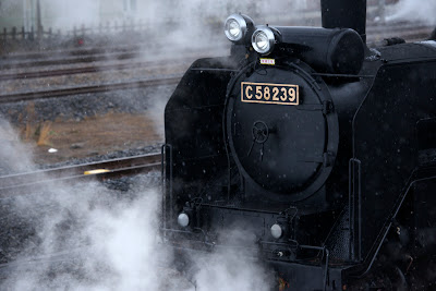 「青空を含んだ風景」・「黒い車体に白い煙を吐いて走るSL」